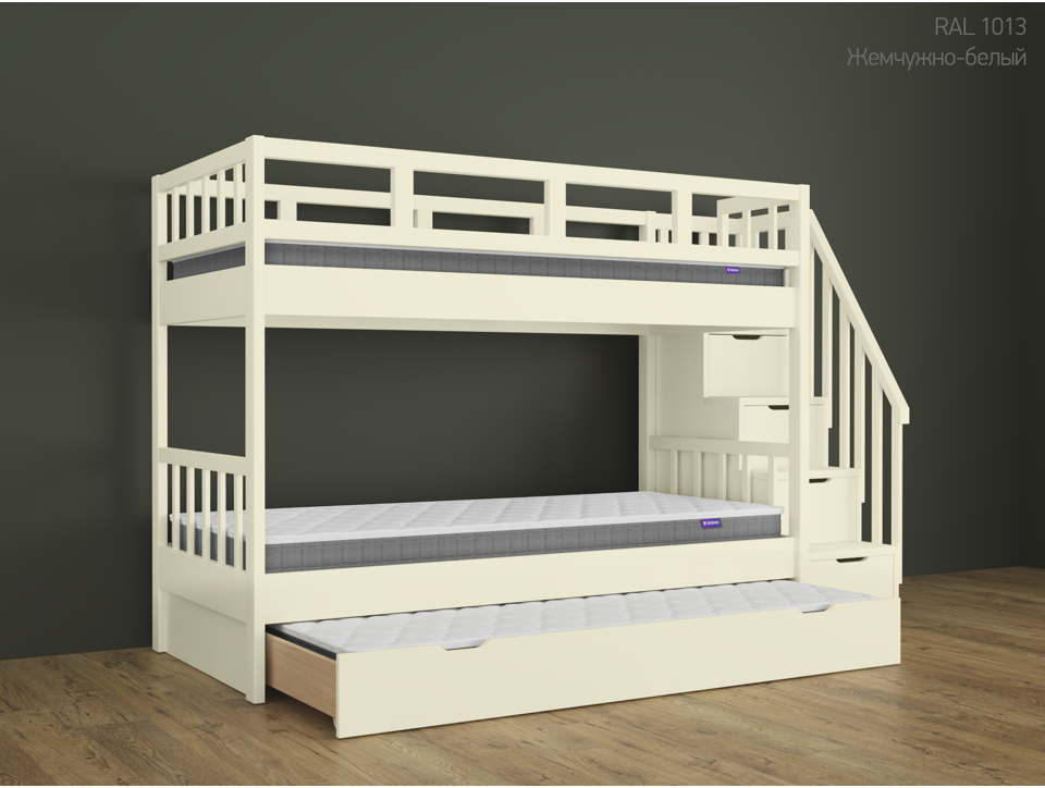 ✅ Кровать укомплектована выкатным спальным местом на колесиках, которое не крепится к кровати (выдвигается полностью). Выкатное спальное место включено в стоимость. Матрасы в комплект не входят!