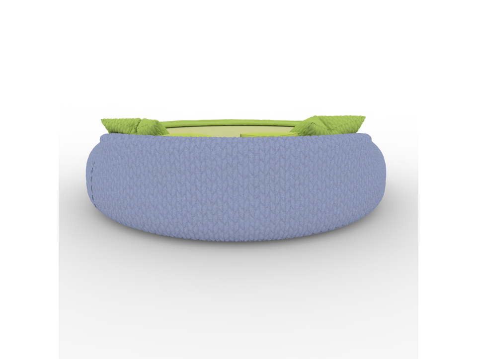 Круглая кровать с невысоким, но широким изголовьем, закрывающим примерно половину окружности. Боковые панели создают чувство уединения. Конструкция выполнена в строгих, прямых линиях.