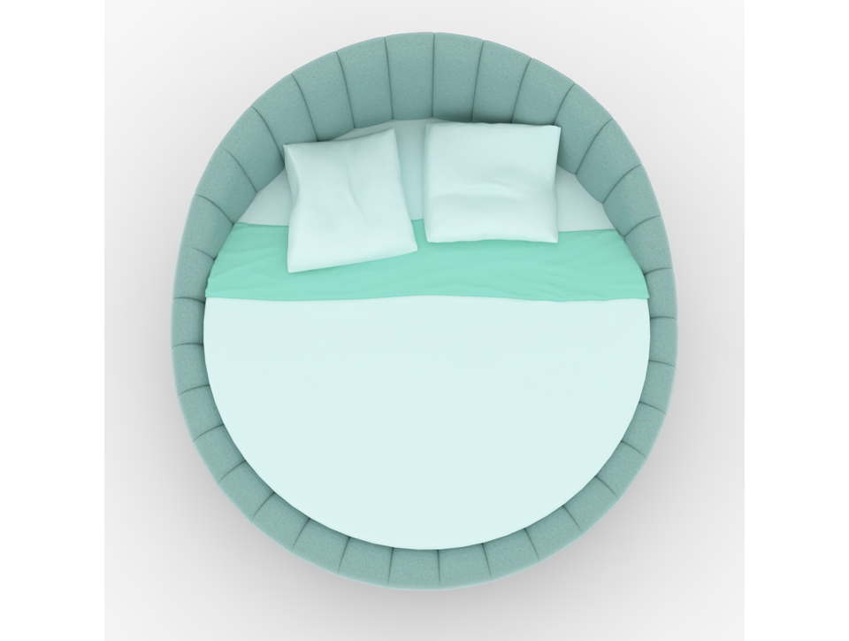 Круглая кровать с мягким сплошным изголовьем, которое обнимает спальную зону примерно на треть окружности. Основание массивное и полностью обтянуто тканью. Опора выполнена на маленьких скрытых ножках.