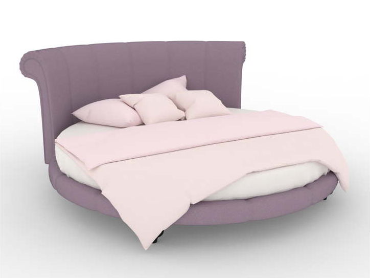 Круглая кровать с высоким изогнутым изголовьем, которое плавно переходит в боковые части, образуя уютный полукруг. Основание цельное, без визуального разделения, обтянуто тканью по всей окружности. Конструкция создаёт эффект защищенного пространства.