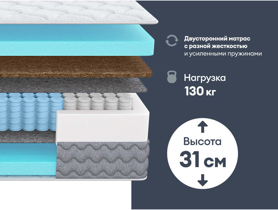 -Универсальные параметры: Матрас выдерживает нагрузку до 130 кг на спальное место, обеспечивая надёжный сон для разных типов фигур. Высота матраса – 31 см.